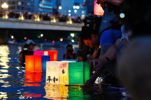 (250806) -- HIROSHIMA, 6 agosto, 2025 (Xinhua) -- Personas colocan linternas de papel en un río en el Parque Memorial de la Paz de Hiroshima, en Hiroshima, Japón, el 6 de agosto de 2025. (Xinhua/Jia Haocheng) (ah) (vf)