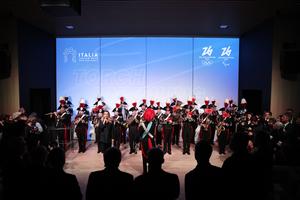 (250414) -- OSAKA, 14 abril, 2025 (Xinhua) -- Imagen del 14 de abril de 2025 de la ceremonia de develación de las antorchas para los Juegos Olímpicos y Paralímpicos de Invierno Milano Cortina 2026, en el Pabellón Italiano, en Osaka, Japón. (Xinhua/Jia Haocheng) (rtg) (ah) (ce)