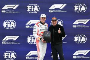 (250405) -- SUZUKA, 5 abril, 2025 (Xinhua) -- El piloto neerlandés de la escudería Red Bull, Max Verstappen (i), quien obtuvo la pole position, sostiene un neumático que él mismo autografió mientras posa para fotografías junto al expiloto francés de F1, Jean Alesi, al término de la sesión de clasificación del Gran Premio de Japón de Fórmula Uno 2025 en el Circuito de Suzuka, en Suzuka, Japón, el 5 de abril de 2025. (Xinhua/Qian Jun) (rtg) (da)