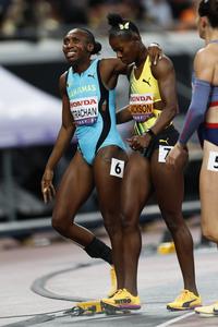 (250918) -- TOKIO, 18 septiembre, 2025 (Xinhua) -- Shericka Jackson (d), de Jamaica, ayuda a Anthonique Strachan, de Bahamas, al término de la semifinal de 200m femeninos, en el Campeonato Mundial de Atletismo 2025, en Tokio, Japón, el 18 de septiembre de 2025. (Xinhua/Wang Lili) (da) (ra) (ce)