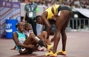 (250918) -- TOKIO, 18 septiembre, 2025 (Xinhua) -- Shericka Jackson (d), de Jamaica, ayuda a Anthonique Strachan, de Bahamas, al término de la semifinal de 200m femeninos, en el Campeonato Mundial de Atletismo 2025, en Tokio, Japón, el 18 de septiembre de 2025. (Xinhua/Jiang Han) (da) (ra) (ce)