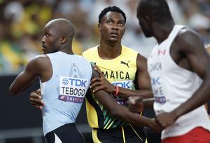 (250918) -- TOKIO, 18 septiembre, 2025 (Xinhua) -- Letsile Tebogo (i), de Botsuana, saluda a Bryan Levell (c), de Jamaica, al término de la semifinal de 200m masculinos en el Campeonato Mundial de Atletismo 2025, en Tokio Japón, el 18 de septiembre de 2025. (Xinhua/Wang Lili) (da) (ra) (vf)