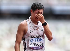 (250920) -- TOKIO, 20 septiembre, 2025 (Xinhua) -- David Hurtado, de Ecuador, reacciona al término de la final de 20km de marcha masculina, en el Campeonato Mundial de Atletismo 2025, en Tokio, Japón, el 20 de septiembre de 2025. (Xinhua/Jia Haocheng) (oa) (ra) (ce)