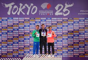 (250914) -- TOKIO, 14 septiembre, 2025 (Xinhua) -- El medallista de oro, Evan Dunfee (c), de Canadá, el medallista de plata, Caio Bonfim (i), de Brasil y el medallista de bronce, Katsuki Hayato, de Japón, posan durante la ceremonia de premiación del evento de 35 km de marcha masculina en el Campeonato Mundial de Atletismo 2025, en Tokio, Japón, el 14 de septiembre de 2025. (Xinhua/Ju Huanzong) (rtg) (ah)
