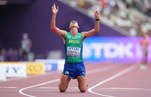 (250913) — TOKIO, 13 septiembre, 2025 (Xinhua) — El medallista de plata Caio Bonfim, de Brasil, festeja al término de la final de 35 km de marcha masculina en el Campeonato Mundial de Atletismo 2025, en el Estadio Nacional, en Tokio, Japón, el 13 de septiembre de 2025. (Xinhua/Lui Siu Wai) (rtg) (da)