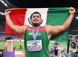 (250913) — TOKIO, 13 septiembre, 2025 (Xinhua) — El medallista de plata Uziel Muñoz (i), de México, festeja al término de la final de lanzamiento de peso masculino en el Campeonato Mundial de Atletismo 2025, en Tokio, Japón, el 13 de septiembre de 2025. (Xinhua/Song Yanhua) (rtg) (da)