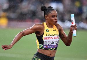 (250921) — TOKIO, 21 septiembre, 2025 (Xinhua) — Tia Clayton, de Jamaica, compite durante la final de relevos 4x100m femeninos en el Campeonato Mundial de Atletismo 2025, en Tokio, Japón, el 21 de septiembre de 2025. (Xinhua/Jiang Han) (rtg) (ah)