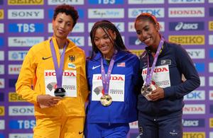 JAPON-TOKIO-ATLETISMO-CAMPEONATO MUNDIAL DE ATLETISMO-SALTO DE LONGITUD FEMENINO-CEREMONIA DE PREMIACION