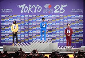 JAPON-TOKIO-ATLETISMO-CAMPEONATO MUNDIAL DE ATLETISMO-SALTO DE LONGITUD MASCULINO-CEREMONIA DE PREMIACION
