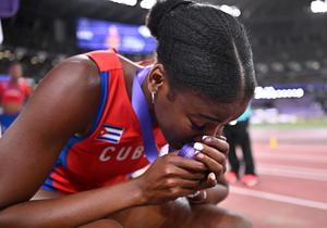 (250918) -- TOKIO, 18 septiembre, 2025 (Xinhua) -- Leyanis Pérez Hernández, de Cuba, besa su medalla al término de la final de salto triple femenino, en el Campeonato Mundial de Atletismo 2025, en Tokio, Japón, el 18 de septiembre de 2025. (Xinhua/Song Yanhua) (jg) (ah) (vf)