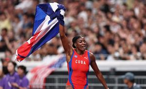(250918) -- TOKIO, 18 septiembre, 2025 (Xinhua) -- Leyanis Pérez Hernández, de Cuba, festeja al término de la final de salto triple femenino, en el Campeonato Mundial de Atletismo 2025, en Tokio, Japón, el 18 de septiembre de 2025. (Xinhua/Jia Haocheng) (jg) (ah) (vf)