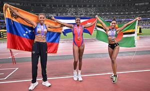 (250918) -- TOKIO, 18 septiembre, 2025 (Xinhua) -- La medallista de oro, Leyanis Pérez Hernández (c), de Cuba, la medallista de plata, Thea Lafond (d), de la Mancomunidad de Dominica, y la medallista de bronce, Yulimar Rojas, de Venezuela, posan al término de la final de salto triple femenino, en el Campeonato Mundial de Atletismo 2025, en Tokio, Japón, el 18 de septiembre de 2025. (Xinhua/Song Yanhua) (jg) (ah) (vf)
