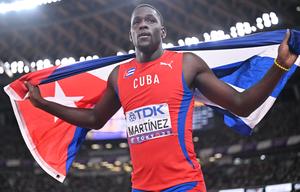 (250919) -- TOKIO, 19 septiembre, 2025 (Xinhua) -- Imagen del 18 de septiembre de 2025 del medallista de bronce Lázaro Martínez, de Cuba, festejando al término de la final de salto triple masculino en el Campeonato Mundial de Atletismo 2025, en Tokio, Japón. (Xinhua/Song Yanhua) (rtg) (ra) (vf)