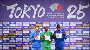 (250920) -- TOKIO, 20 septiembre, 2025 (Xinhua) -- El medallista de oro, Pedro Pichardo (c), de Portugal, el medallista de plata, Andrea Dallavalle (i), de Italia, y el medallista de bronce, Lázaro Martínez, de Cuba, posan durante la ceremonia de premiación de salto triple masculino, en el Campeonato Mundial de Atletismo 2025, en Tokio, Japón, el 20 de septiembre de 2025. (Xinhua/Jiang Han) (oa) (ra) (ce)