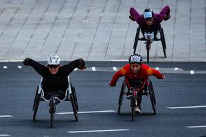 (260301) -- TOKIO, 1 marzo, 2026 (Xinhua) -- Eden Rainbow-Cooper (i), de Reino Unido, y Zhou Zhaoqian, de China, compiten en la carrera élite femenina en silla de ruedas del Maratón de Tokio, en Tokio, Japón, el 1 de marzo de 2026. (Xinhua/Jia Haocheng) (ah) (rtg) (da) (vf)