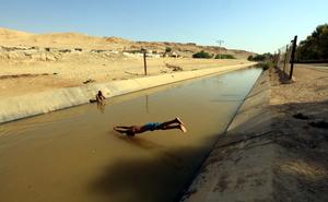 (250921) -- AMAN, 21 septiembre, 2025 (Xinhua) -- Imagen de archivo sin fechar de personas nadando en un canal de riego en el valle del Jordán, Jordania. Jordania se enfrenta a una de las crisis hídricas más graves del mundo, provocada por el cambio climático, la sobreexplotación de los recursos hídricos y el aumento de la demanda, mientras las autoridades locales intentan gestionar la escasez con un sistema de rotación y proyectos de infraestructura a gran escala. (Xinhua/Mohammad Abu Ghosh) (oa) (ah)