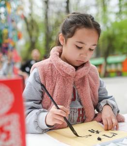 (250419) — ALMATY, 19 abril, 2025 (Xinhua) — Una niña aprende a escribir caracteres chinos en el evento del Día Internacional del Idioma Chino 2025, en Almaty, Kazajistán, el 19 de abril de 2025. Un evento de celebración para conmemorar el Día Internacional del Idioma Chino 2025 se llevó a cabo aquí el sábado, ofreciendo una experiencia cultural inmersiva que combinó la caligrafía china, la pintura tradicional china, el Hanfu y la interpretación del Guzheng (cítara pulsada china). (Xinhua/Li Renzi) (jg) (da)