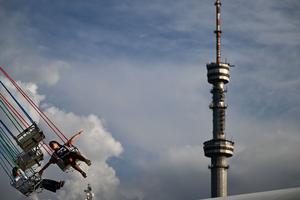 (250514) -- ALMATY, 14 mayo, 2025 (Xinhua) -- Imagen del 13 de mayo de 2025 de personas experimentando instalaciones de entretenimiento en la Montaña Koktobe, en Almaty, Kazajistán. La Montaña Koktobe es uno de los mejores lugares con una vista panorámica de la ciudad de Almaty, así como un sitio famoso para hacer turismo, recreación, gastronomía y entretenimiento. (Xinhua/Li Renzi) (ah) (ra) (ce)