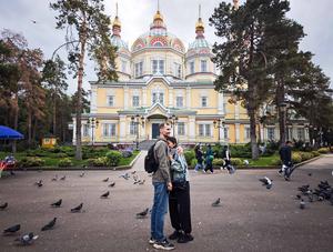 (251007) -- ALMATY, 7 octubre, 2025 (Xinhua) -- Imagen tomada con un teléfono móvil el 30 de septiembre de 2025 de una pareja abrazándose, en el Parque de los 28 Guardias de Panfilov, en Almaty, Kazajistán. (Xinhua/Li Renzi) (jg) (ra) (ce)