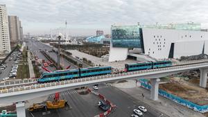 (251019) -- ASTANA, 19 octubre, 2025 (Xinhua) -- Un tren ligero es elevado a la vía, en Astaná, Kazajistán, el 19 de octubre de 2025. Dos trenes para el proyecto Astana Light Rail Transit llegaron a la capital kazaja y estuvieron en funcionamiento del 16 al 19 de octubre para avanzar con los trabajos de prueba, según la administración de la ciudad. (Xinhua/Kalizhan Ospanov) (ah) (da)