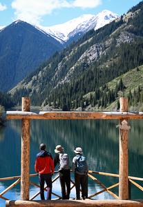 (250504) -- ALMATY, 4 mayo, 2025 (Xinhua) -- Imagen del 3 de mayo de 2025 de turistas visitando el Parque Nacional de los Lagos Kolsai, en la región de Almaty, Kazajistán. (Xinhua/Li Renzi) (oa) (da)