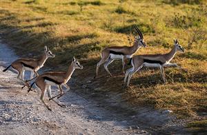 (250922) -- KAJIADO, 22 septiembre, 2025 (Xinhua) -- Imagen del 21 de septiembre de 2025 de gacelas saltando por una carretera en el Parque Nacional Amboseli, en el distrito de Kajiado, Kenia. Situado en la frontera entre Kenia y Tanzania, a los pies del Kilimanjaro, el pico más alto de Africa, el parque es famoso por sus paisajes únicos y es uno de los mejores lugares de Kenia para observar diversos animales salvajes. (Xinhua/Li Yahui) (oa) (ah) (vf)