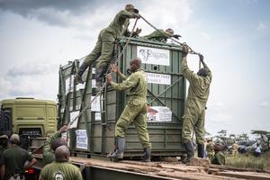 (250525) -- LAIKIPIA, 25 mayo, 2025 (Xinhua) -- Imagen del 24 de mayo de 2025 de miembros del Servicio de Vida Silvestre de Kenia preparándose para liberar a un rinoceronte negro reubicado en la Reserva Natural Segera, en Laikipia, Kenia. (Xinhua/Wang Guansen) (rtg) (da)