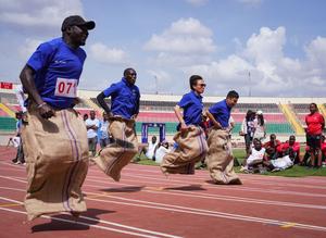 (251205) — NAIROBI, 5 diciembre, 2025 (Xinhua) — Imagen del 4 de diciembre de 2025 de participantes compitiendo en la carrera de sacos en los Juegos de la Amistad China-Kenia, en Nairobi, Kenia. Los primeros Juegos de la Amistad China-Kenia se llevaron a cabo el jueves en Nairobi, capital de Kenia, como parte de los esfuerzos para reforzar los lazos bilaterales. (Xinhua/Han Xu) (rtg) (ra) (ce)