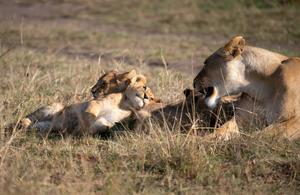 (250909) -- NAIROBI, 9 septiembre, 2025 (Xinhua) -- Imagen del 1 de septiembre de 2025 de una leona descansando en la pradera con sus cachorros en la Reserva Nacional Masái Mara, en el condado de Narok, Kenia. (Xinhua/Yang Guang) (jg) (ra) (ce)
