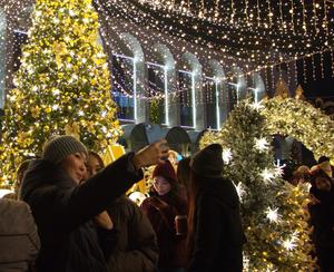 (251216) -- BISHKEK, 16 diciembre, 2025 (Xinhua) -- Imagen del 15 de diciembre de 2025 de personas tomando fotografías durante la ceremonia de encendido del árbol de Año Nuevo, en Bishkek, Kirguistán. (Xinhua/Liu Xiaowan) (jg) (ra) (vf)