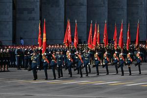 (250509) -- BISHKEK, 9 mayo, 2025 (Xinhua) -- Imagen del 8 de mayo de 2025 de personal militar marchando durante un desfile militar para conmemorar el 80° aniversario de la victoria en la Gran Guerra Patriótica, en Bishkek, Kirguistán. (Xinhua/Oficina del Presidente de la República Kirguisa) (jg) (da) (vf)