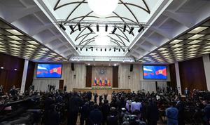 (251126) -- BISHKEK, 26 noviembre, 2025 (Xinhua) -- El presidente ruso, Vladimir Putin, y el presidente kirguís, Sadyr Japarov, asisten a una conferencia de prensa conjunta, en Bishkek, Kirguistán, el 26 de noviembre de 2025. Japarov y Putin sostuvieron conversaciones aquí el miércoles, después de lo cual ambos líderes emitieron declaraciones destacando la cooperación en comercio e inversión. (Xinhua/Oficina del Presidente de la República Kirguisa) (jg) (da) (ce)