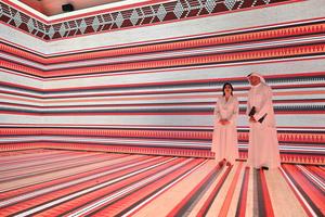 (250520) -- CIUDAD DE KUWAIT, 20 mayo, 2025 (Xinhua) -- Imagen del 19 de mayo de 2025 de personas observando un espectáculo de arte en pantallas interactivas durante una celebración organizada por la Sociedad Kuwaití Al-Sadu, en la Ciudad de Kuwait, Kuwait. La Sociedad Kuwaití Al-Sadu celebró el lunes la designación de la Ciudad de Kuwait como Ciudad Mundial de la Artesanía del Tejido Al-Sadu por parte del Consejo Mundial de Artesanías, en honor a la centenaria tradición textil beduina y subrayando los esfuerzos para preservar esta forma de arte única. (Xinhua/Asad) (oa) (ah) (vf)
