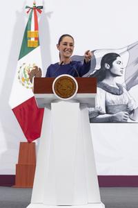(250507) -- CIUDAD DE MÉXICO, 7 mayo, 2025 (Xinhua) -- Imagen cedida por la Presidencia de México de la presidenta mexicana, Claudia Sheinbaum, reaccionando durante su conferencia de prensa matutina en Palacio Nacional, en la Ciudad de México, capital de México, el 7 de mayo de 2025. Sheinbaum informó el miércoles que aún no hay acuerdos, pero se avanza con el Gobierno de Estados Unidos en las negociaciones sobre aranceles al acero, el aluminio y los vehículos, así como a productos agrícolas como el tomate mexicano. (Xinhua/Presidencia de México) (jg) (da) (vf)
