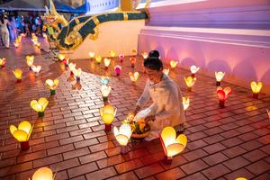 (251008) -- VIENTIAN, 8 octubre, 2025 (Xinhua) -- Imagen del 7 de octubre de 2025 de una mujer encendiando una linterna en un templo, en Vientián, Laos. (Xinhua/Kaikeo Saiyasane) (jg) (da) (ce)