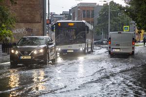 (250826) — RIGA, 26 agosto, 2025 (Xinhua) — El tráfico se ve afectado por las calles inundadas tras las fuertes lluvias caídas, en Riga, Letonia, el 26 de agosto de 2025. Riga se vio afectada por fuertes tormentas eléctricas durante la noche y la mañana del 26 de agosto, con las intensas lluvias provocaron inundaciones en algunas calles del centro de la ciudad. (Xinhua/Edijs Palens) (oa) (ah) (vf)