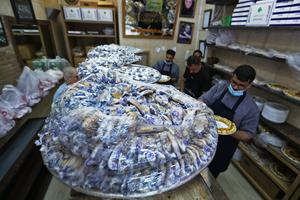 (250606) -- BEIRUT, 6 junio, 2025 (Xinhua) -- Imagen del 5 de junio de 2025 de vendedores acomodando dulces en preparación para el Eid al-Adha, en Beirut, Líbano. (Xinhua/Bilal Jawich) (oa) (ra) (ce)