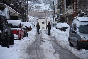 (250208) -- BSHARRI, 8 febrero, 2025 (Xinhua) -- Imagen del 7 de febrero de 2025 de personas permaneciendo en una calle después de una nevada, en Bisharri, Líbano. (Xinhua/Khaled Habashiti) (oa) (da)