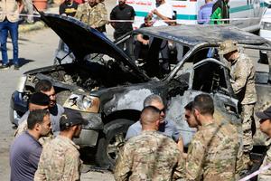 (250421) -- BRAIQAA, 21 abril, 2025 (Xinhua) -- Imagen del 20 de abril de 2025 de soldados del Ejército libanés vistos cerca de un vehículo destruido en una explosión de municiones, en Braiqaa, Líbano. Un oficial del Ejército libanés y dos soldados murieron el domingo en una explosión de municiones, en el sur de Líbano, de acuerdo con una declaración emitida por la Dirección de Orientación del Ejército. De acuerdo con la declaración, varios civiles también resultaron heridos en la explosión que se produjo "cuando la munición estaba siendo transportada por un vehículo militar en el área de Braiqaa, en la Gobernación de Nabatieh". (Xinhua/Ali Hashisho) (rtg) (ah) (ce)