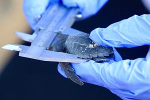 (250722) — MANSOURI, 22 julio, 2025 (Xinhua) — Imagen del 21 de julio de 2025 de un activista ambiental libanés midiendo una tortuga marina recién nacida previo a liberarla en el mar, en Mansouri, Líbano. Las crías forman parte de un programa de conservación destinado a aumentar la población de tortugas marinas y crear conciencia pública sobre la protección de la vida marina. (Xinhua/Ali Hashisho) (oa) (ah) (vf)