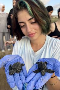 (250722) -- MANSOURI, 22 julio, 2025 (Xinhua) -- Imagen del 21 de julio de 2025 de una mujer mostrando tortugas marinas recién eclosionadas previo a liberarlas en el mar, en Mansouri, Líbano. Las crías forman parte de un programa de conservación destinado a aumentar la población de tortugas marinas y crear conciencia pública sobre la protección de la vida marina. (Xinhua/Ali Hashisho) (oa) (ah) (vf)
