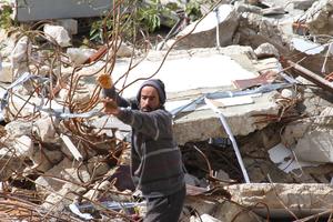 (250222) -- MAYS AL-JABAL, 22 febrero, 2025 (Xinhua) -- Imagen del 21 de febrero de 2025 de un hombre inspeccionando una vivienda destruida, en Mays al-Jabal, Líbano. Los residentes han regresado tras la retirada israelí el 18 de febrero. (Xinhua/Taher Abu Hamdan) (oa) (da)