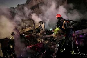 (251011) -- MSAYLEH, 11 octubre, 2025 (Xinhua) -- Personas intentan apagar el fuego en vehículos pesados destruidos tras ataques aéreos israelíes, en Msayleh, Líbano, el 11 de octubre de 2025. (Xinhua/Ali Hashisho) (oa) (da)