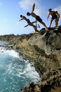 (250721) -- SIDON, 21 julio, 2025 (Xinhua) -- Imagen del 20 de julio de 2025 de personas saltando hacia el mar desde la costa de Sidón, Líbano. (Xinhua/Ali Hashisho) (rtg) (ah) (ce)
