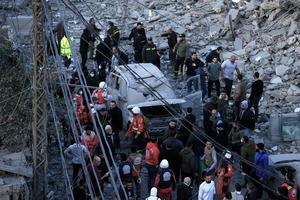 (260304) -- SIDON, 4 marzo, 2026 (Xinhua) -- Imagen del 3 de marzo de 2026 de rescatistas trabajando en el sitio de las oficinas del Grupo Islámico destruidas por los ataques aéreos israelíes, en Sidón, en el sur de Líbano. (Xinhua/Ali Hashisho) (ah) (ra) (vf)