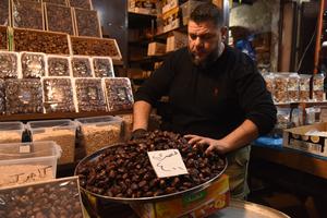 (250228) -- TRÍPOLI, 28 febrero, 2025 (Xinhua) -- Imagen del 27 de febrero de 2025 de un tendero arreglando productos previo al mes sagrado del Ramadán, en Trípoli, Líbano. (Xinhua/Khaled Habashiti) (rtg) (ra) (ce)