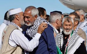 (251009) — TRIPOLI, 9 octubre, 2025 (Xinhua) — Imagen del 8 de octubre de 2025 de personas recibiendo a los tripulantes de la Flotilla Global Sumud liberados de la custodia israelí en el Aeropuerto Internacional de Mitiga, en Trípoli, Libia. El barco libio «Omar Al Mukhtar» partió de Trípoli el 21 de septiembre para unirse a la Flotilla Global Sumud con destino a Gaza. Durante el trayecto, el barco fue interceptado por Israel y la tripulación fue detenida. (Xinhua/Hazem Turkia) (da) (ra) (vf)
