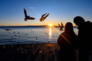(260112) — OHRID, 12 enero, 2026 (Xinhua) — Personas disfrutan del atardecer junto al Lago Ohrid, en Ohrid, Macedonia del Norte, el 12 de enero de 2026. (Xinhua/Tomislav Georgiev) (oa) (ah) (vf)