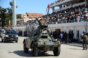 (250626) -- ANTANANARIVO, 26 junio, 2025 (Xinhua) -- Un desfile militar se lleva a cabo durante una celebración para conmemorar el 65 aniversario de la independencia de Madagascar, en Antananarivo, Madagascar, el 26 de junio de 2025. (Xinhua/Sitraka Rajaonarison) (rtg) (ra) (vf)