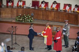(251017) -- ANTANANARIVO, 17 octubre, 2025 (Xinhua) -- Michael Randrianirina (i-frente) asiste a la ceremonia de juramentación, en el Tribunal Constitucional de Madagascar en Antananarivo, Madagascar, el 17 de octubre de 2025. Michael Randrianirina, un oficial militar malgache, juró el viernes como presidente de Madagascar en la capital. (Xinhua/Sitraka Rajaonarison) (oa) (ra) (ce)